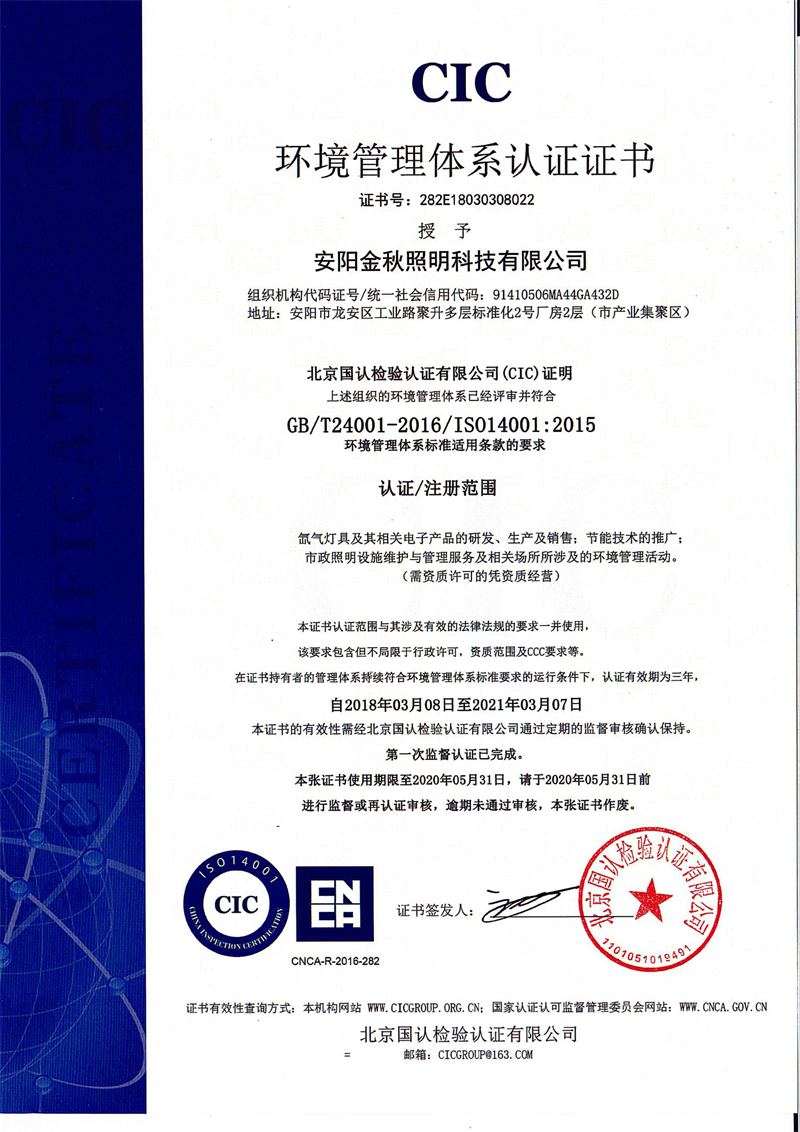 金秋照明喜獲三項國際管理體系2019年度監(jiān)督認(rèn)證證書