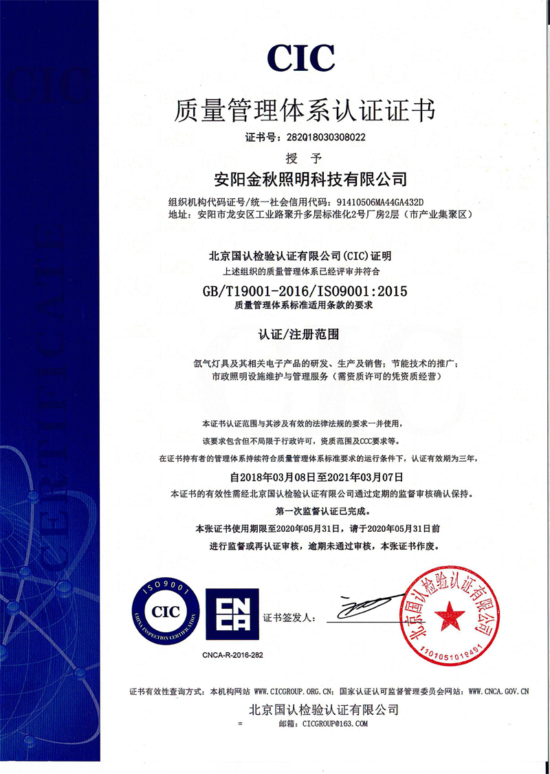 畢竟燈園六月中,風(fēng)光不與四時同。2019年6月,經(jīng)中國權(quán)威認(rèn)證機(jī)構(gòu)CIC歷時三個多月的監(jiān)督評審,金秋照明正式通過了ISO9001、ISO14001、ISO45001三項國際管理體系2019年度監(jiān)督認(rèn)證,并于6月27日喜獲新的認(rèn)證證書。